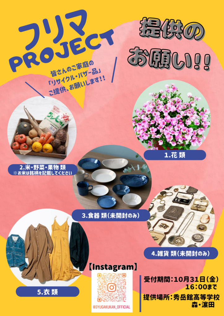 下記の通り、秀岳祭を開催いたします。個性あふれるステージ発表で盛り上げます。 バザーも実施します。ぜひご来場ください! 記 日 時:11月2日(日)9:00~12:00 ステージ部門 11月3日(月)9:00~15:00 バザー部門