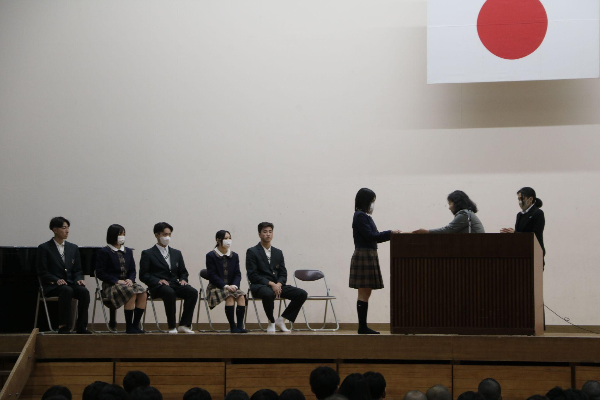 また、弓道部と女子サッカー部から、全国大会に出場した試合結果の報告がありました。弓道部は女子個人第3位と男子個人第4位で、女子サッカー部は全国大会ベスト16という結果でした。両部ともに悔しさを感じる場面もあったものの、その思いを次につなげ、今後さらに努力していく決意を力強く語ってくれました。